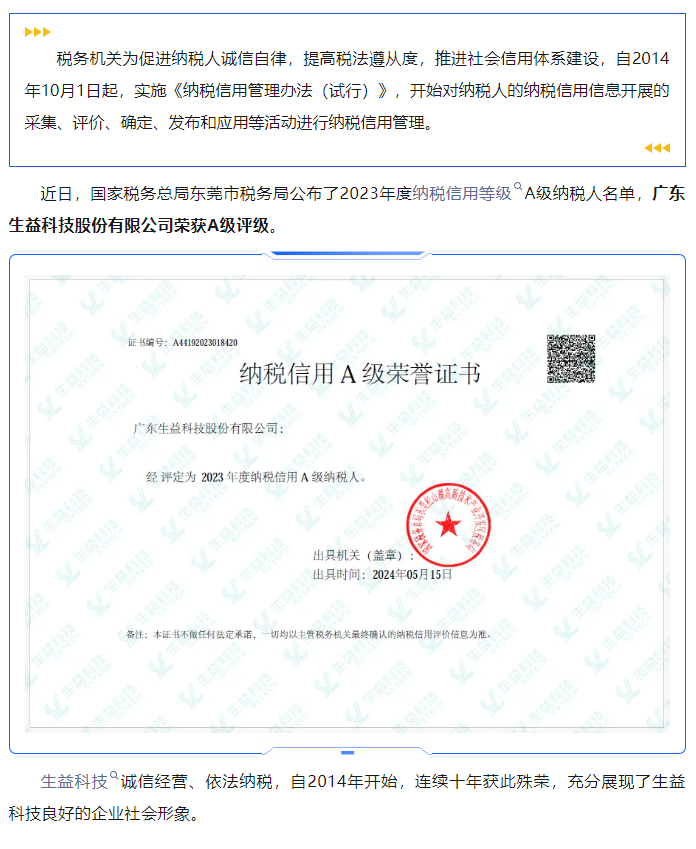 广东B体育·BSPORTS科技荣获2023年度“纳税信用等级A级”评级