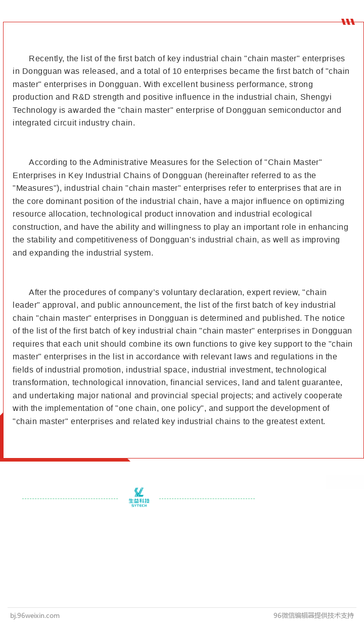 SHENGYI TECHNOLOGY SELECTED AS "CHAIN MASTER" OF THE FIRST BATCH OF KEY INDUSTRIAL CHAIN ENTERPRISES IN DONGGUAN